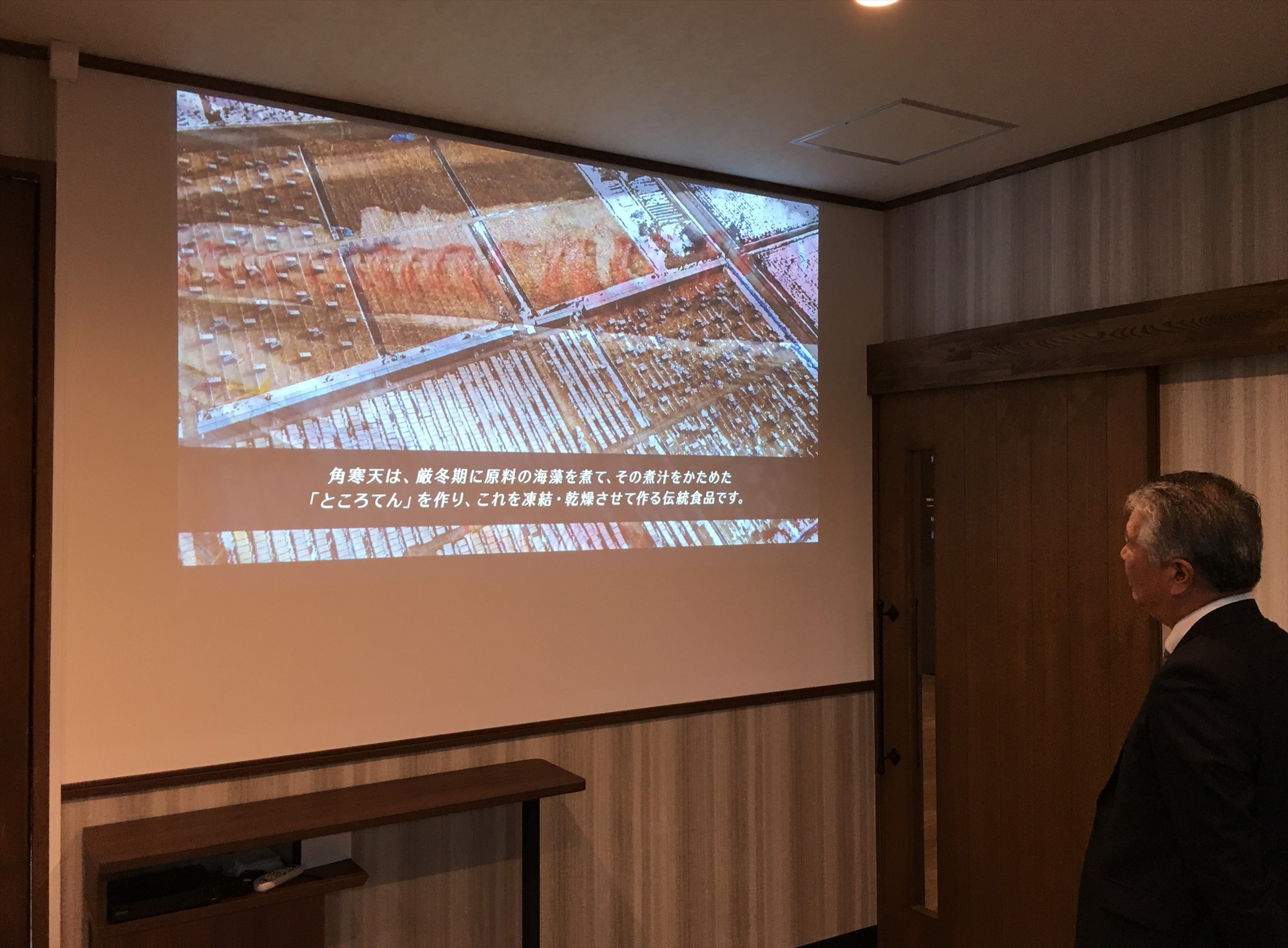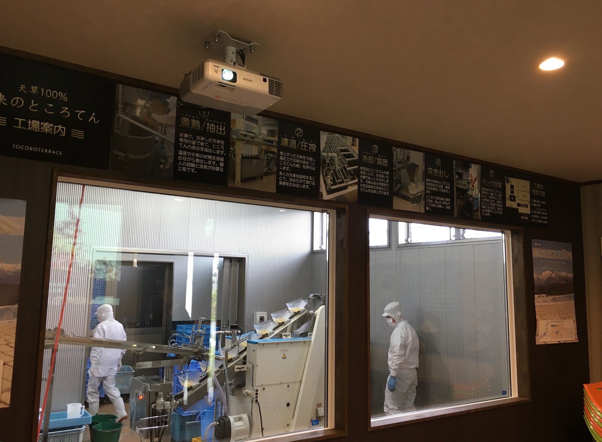 訪れたお客様が、壁に掛けられた大きなパネルを見て、寒天の製造風景や過程などの理解を深めていました。