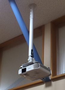 元々常設の大型スクリーンがあり、そこに移動式のプロジェクターで投影されていましたが、機械も古くなり使用頻度も多くなってきたということから、この度新しくEPSON EB-960Wを天吊りにて導入されることになりました。