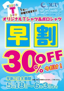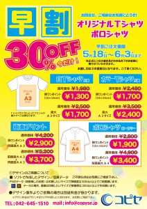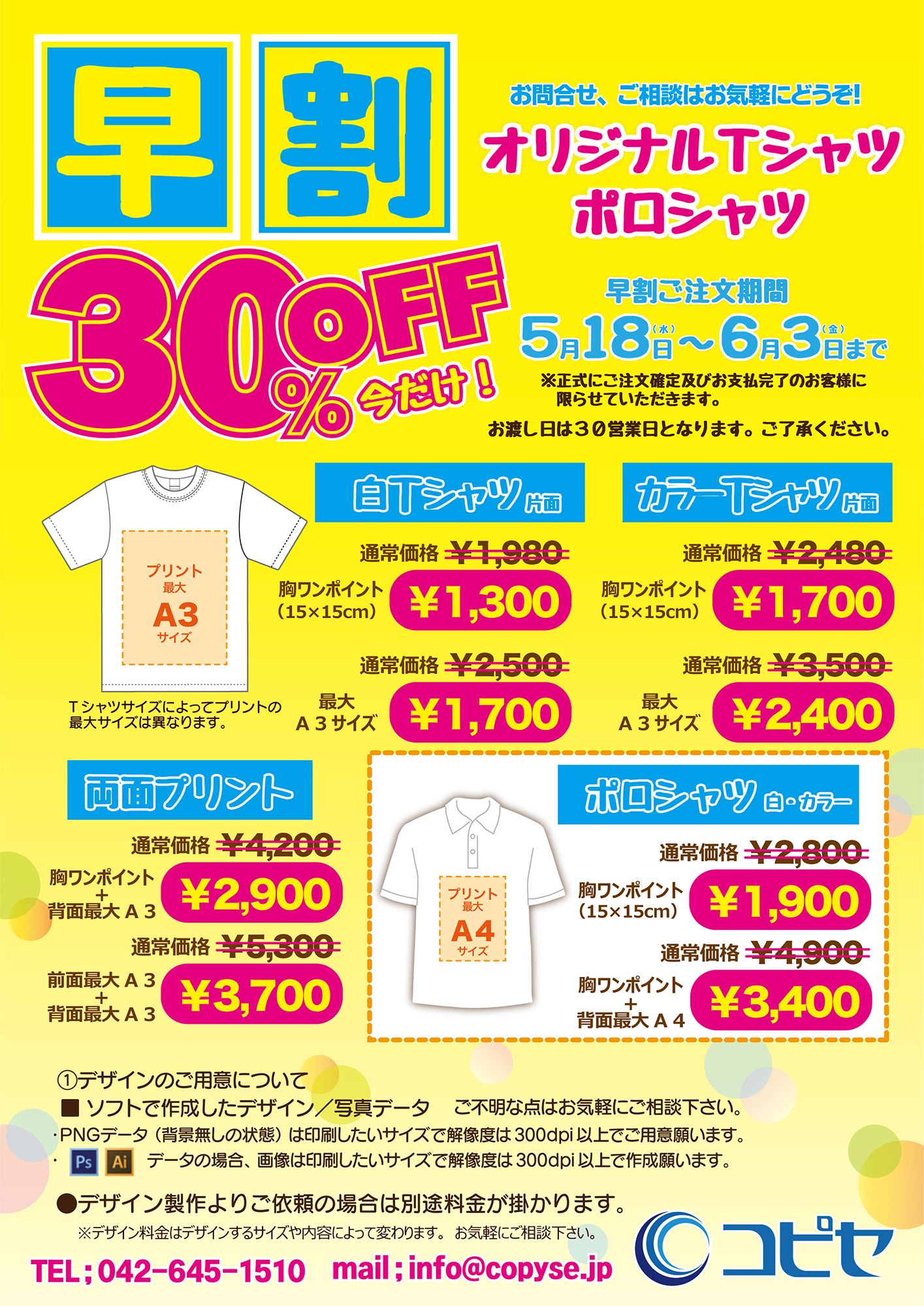 オリジナルデザインTシャツ・ポロシャツのコピセ八王子店にて、早割30%OFFキャンペーンを開催中です。