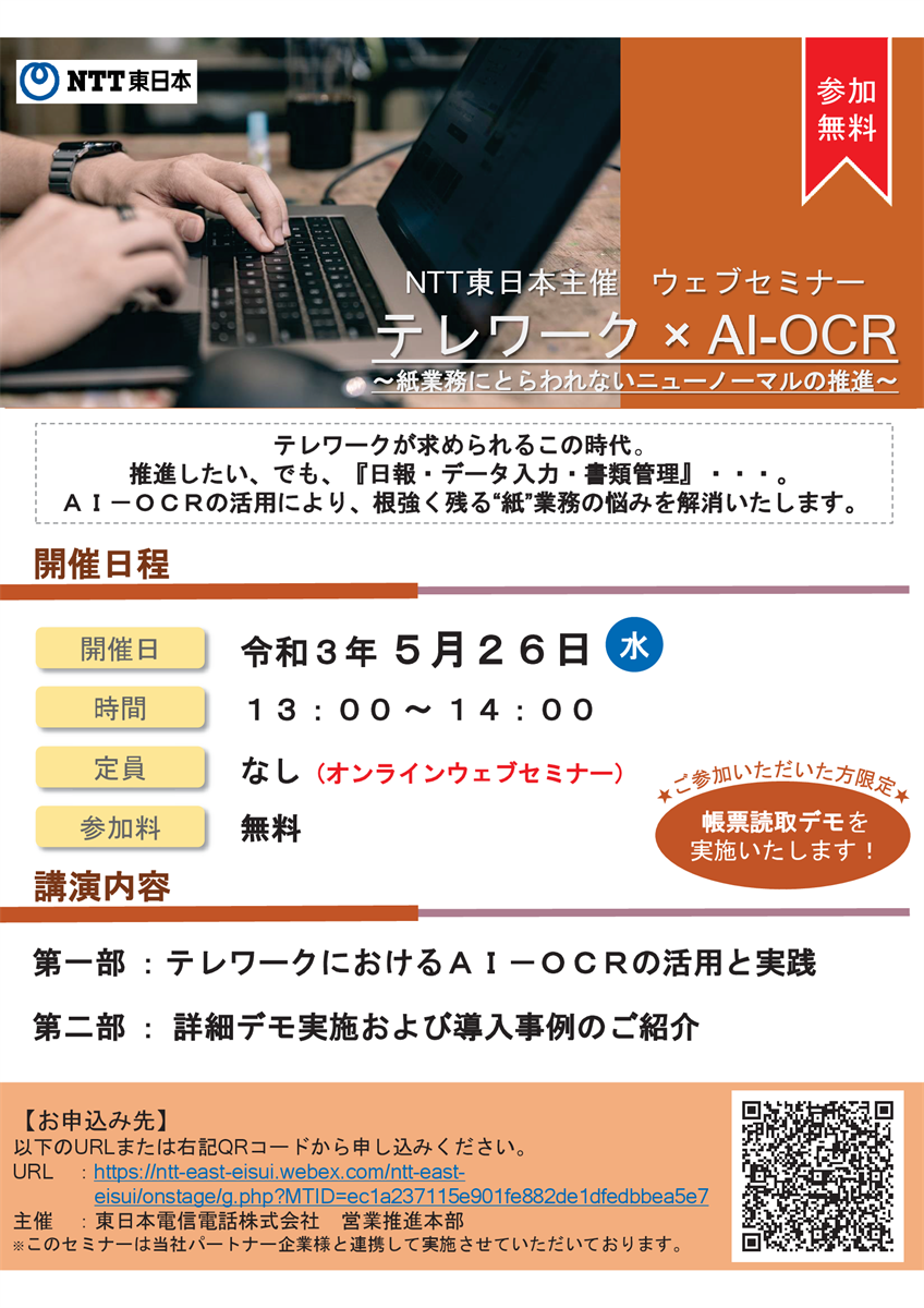 【テレワーク×AI-OCR ~紙業務にとらわれないニューノーマルの推進】と題しまして、NTT東日本主催でWEBセミナーを実施いたします。