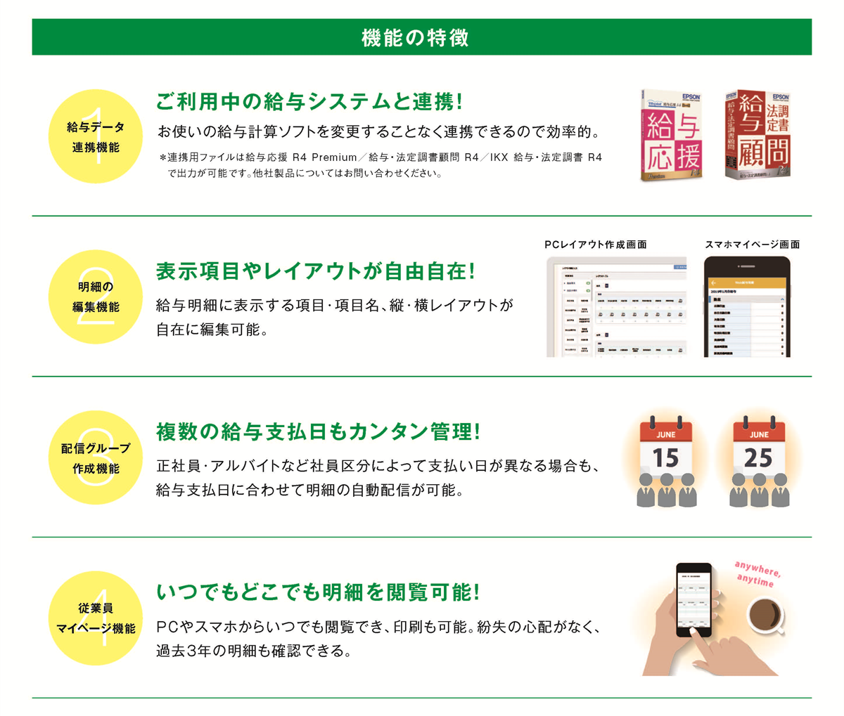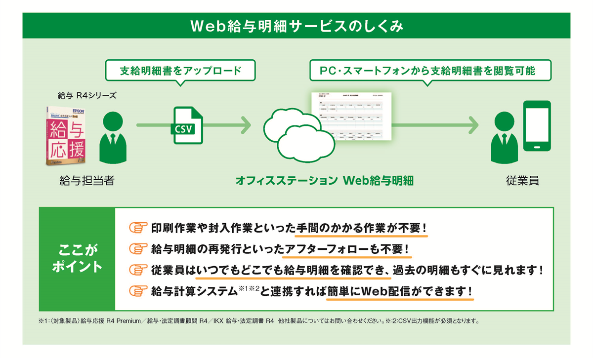 印刷作業や封入作業といった手間のかかる作業が不要!給与明細の再発行といったアフターフォローも不要!従業員はいつでもどこでも給与明細を確認でき、過去の明細もすぐに見れます!給与計算システムと連携すれば簡単にWeb配信ができます!
