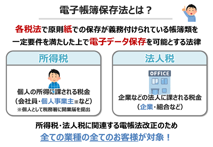 各税法で原則紙での保存が義務付けられている帳簿類を一定要件を満たした上で電子データ保存を可能とする法律です。