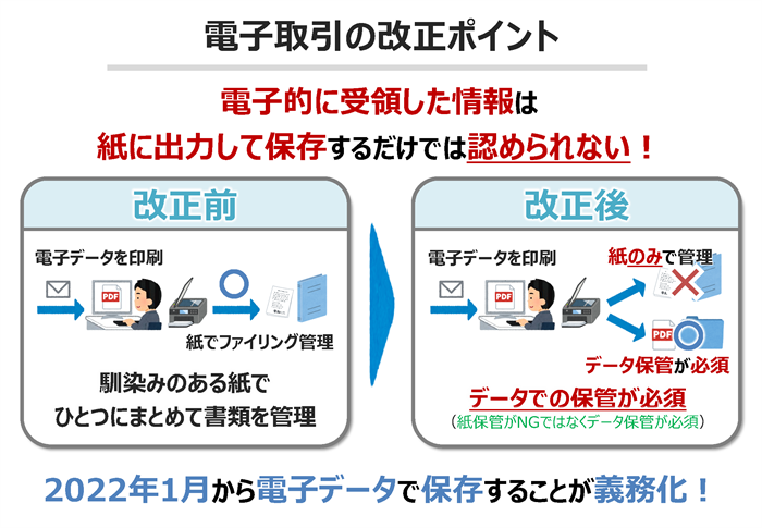 昨今、ほとんどの企業がペーパーレス化を促進しています。そして今回、電子帳簿保存法の改正で、「電子取引」について厳格化されます。